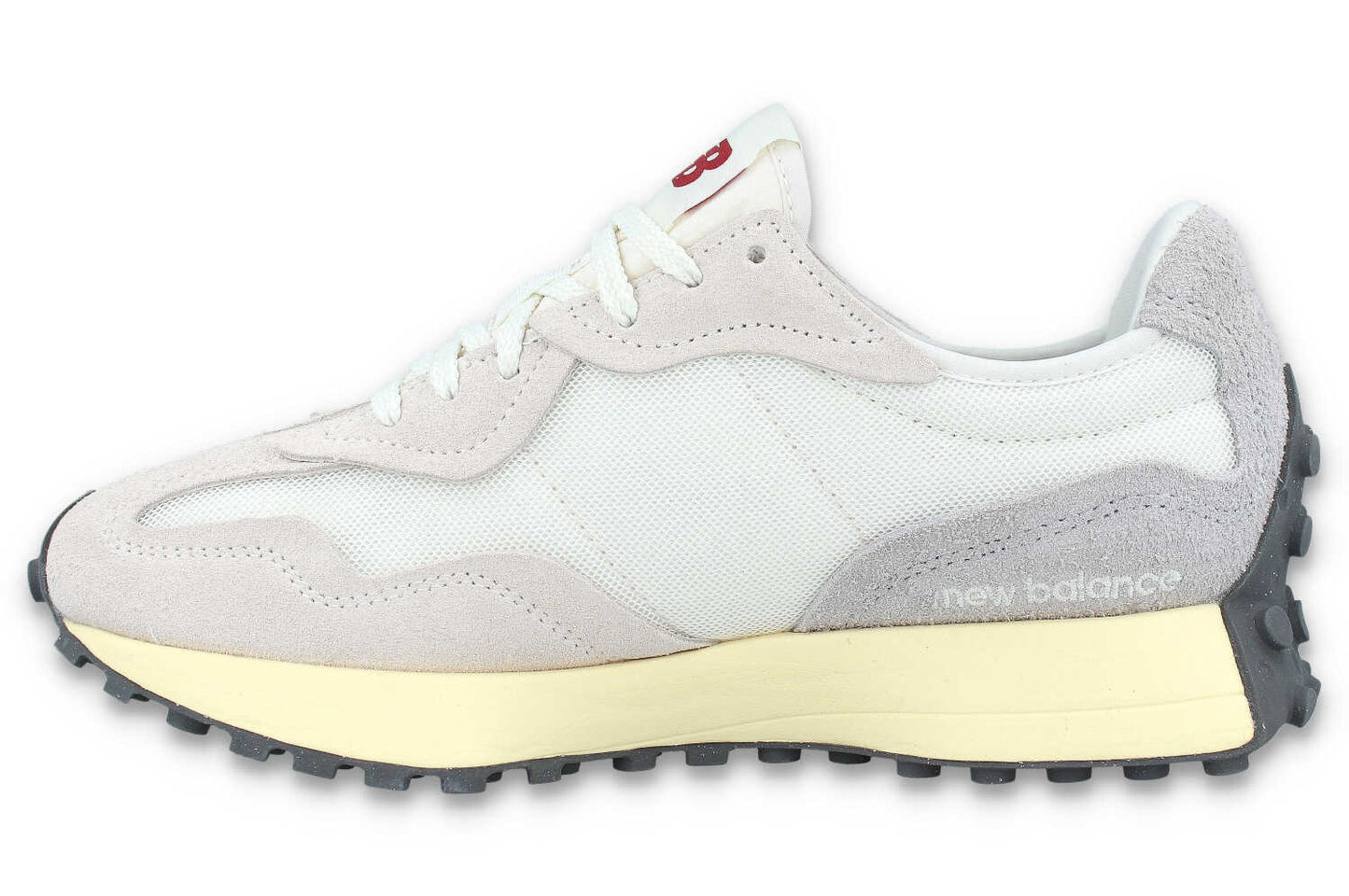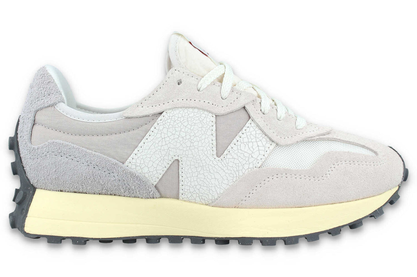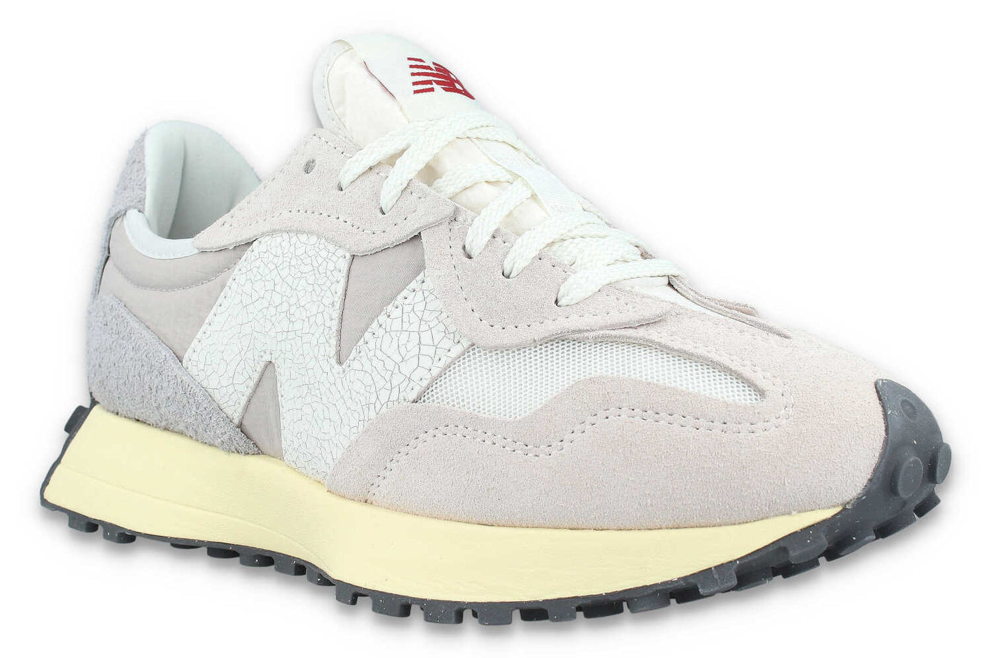 Als Freizeitjogging in den Siebzigerjahren populär wurde, verlagerte sich der Anspruch an Laufschuhe von der bloßen Existenz zur Leistung. Auch wenn die Designs dieser Zeit nach heutigen Maßstäben als schlicht zu bezeichnen sind, so haben sich Laufschuhe in diesem Jahrzehnt doch etabliert. Der 327 wirft ein neues Licht auf die Siebzigerjahre als Zeit der Innovation, indem er klassische Designelemente kühn aufgreift und auf durch und durch moderne Weise neu gestaltet. Mit einer kantigen Neuinterpretation der bewährten Keilsilhouette, einem übergroßen, asymmetrisch angebrachten 'N'-Branding und einer umlaufenden Stollen-Laufsohle im Trail-Stil bietet der 327 nicht weniger als eine komplette Neuinterpretation unseres traditionellen Laufschuhs.